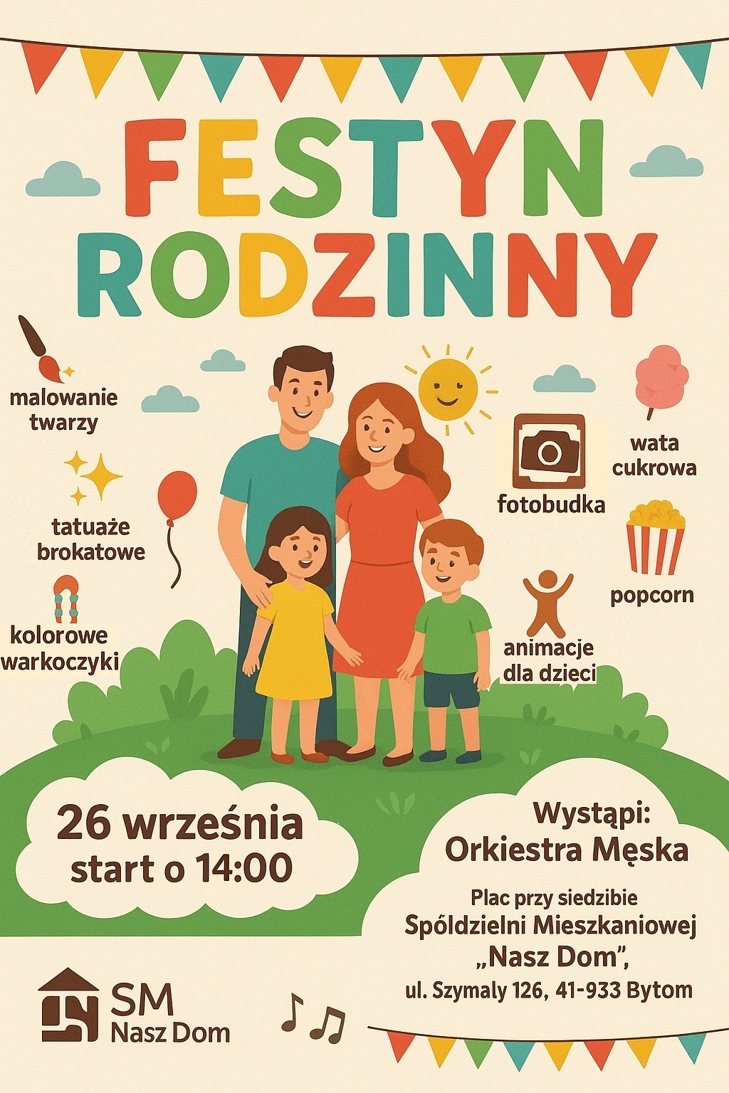 Serdecznie zapraszamy w imieniu Spółdzielni Mieszkaniowej ‘Nasz Dom’ na Festyn Rodzinny, który odbędzie się dnia 26 września przy ul. Szymały 126. Jako partner organizowanego Festynu oferujemy w tym dniu specjalną ofertę skierowaną do nowych klientów.