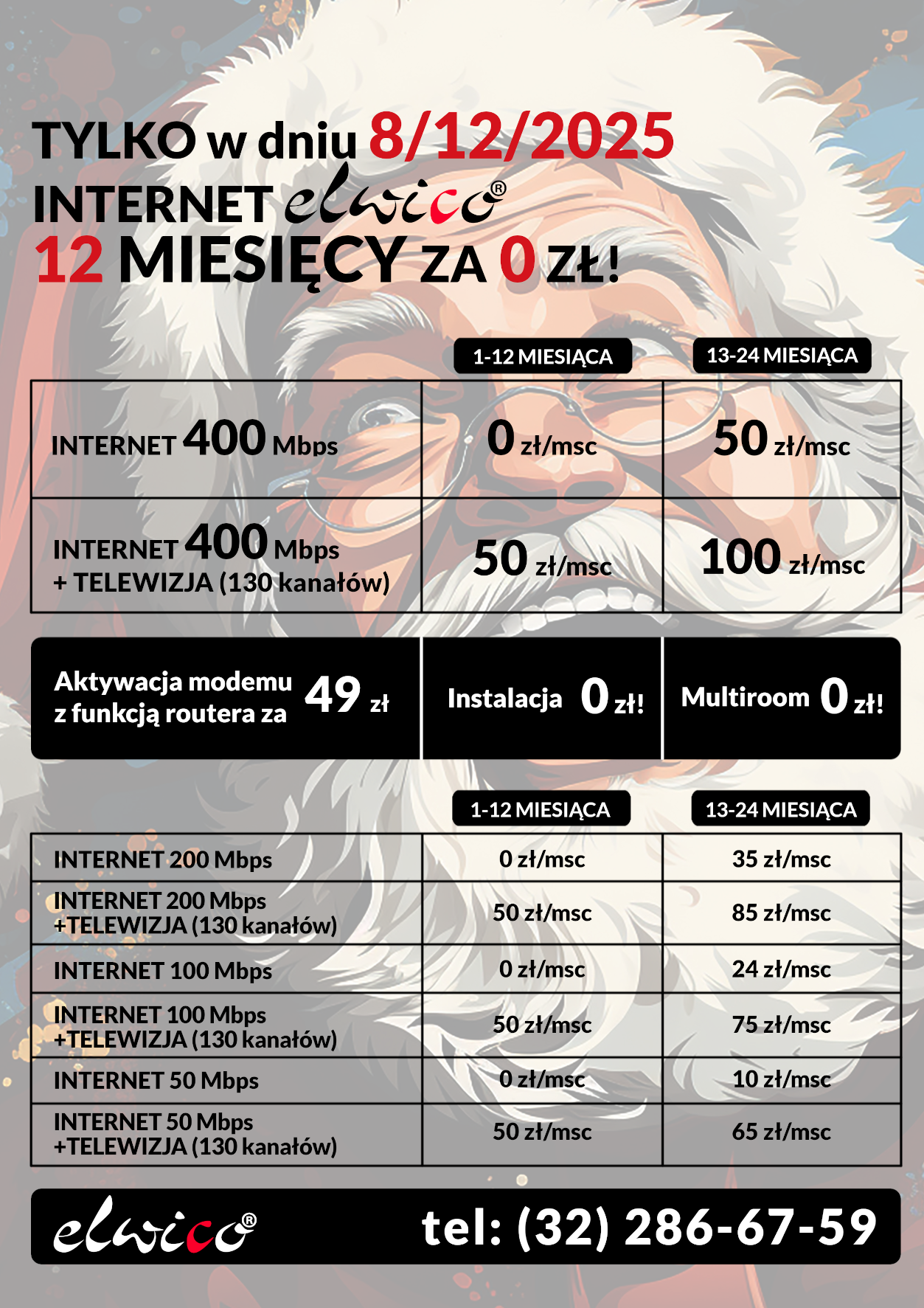 - Oferta Promocyjna dostępna tylko przy złożeniu zamówienia na usługę Internetu lub pakietu usług: Internet + Telewizja, w dniu 8/12/2025 do Biura Obsługi Klienta.