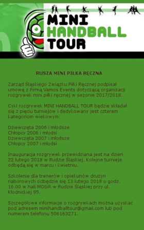 W Tarnowskich Górach dziewcząta rywalizować będą w turnieju im. Władysława Babireckiego. Liga Czesko-Polsko-Słowacka zawita do Łodygowic (dziewczęta) i Mysłowic (chłopcy). Najmłodsi adepci i adeptki piłki ręcznej zaprezentują swoje umiejętności w Piekarach Śląskich w ramach programu Gramy w Ręczną.