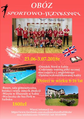 Obóz sportowo - językowy w Ośrodku Wypoczynkowym Nord w Łebie. Zapraszamy dzieci i młodzież w wieku 8 - 16 lat zainteresowanych piłką ręczną. Zajęcia poprowadzi m.in. były trener reprezentacji Krzysztof Przybylski.