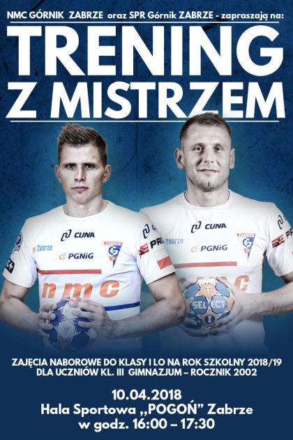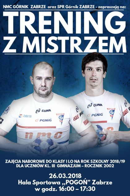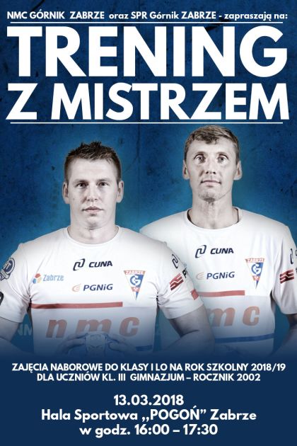 13.03.2018 o godz. 16 w hali sportowej "Pogoń" w Zabrzu odbedą się zajecia naborowe do klasy I liceum pod hasłem "Trening z mistrzem".